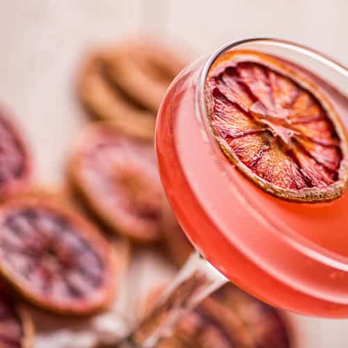 Add the ingredients (except champagne) to a cocktail shaker with ice and shake thoroughly. Pour 2 oz of champagne into the glass, strain the rest of the mix into the glass. Garnish with a blood orange wheel.