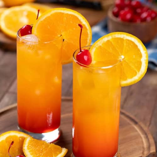 Fill a glass with ice. Pour in orange juice and pineapple juice, stirring gently to combine. Slowly pour grenadine down the side of the glass, letting it settle at the bottom for a layered effect. Garnish with an orange slice and a cherry.