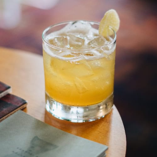 Shake all ingredients with ice. Strain into a rocks glass with ice. Garnish with a lemon wedge.