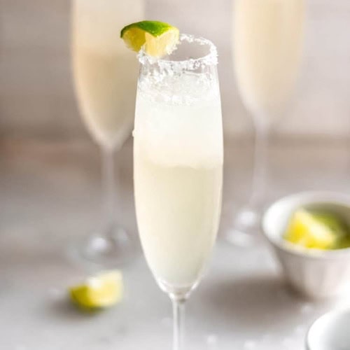 Wet the rim of the margarita glass and dip it into the salt, Place the tequila and lime juice in a champagne flute, top with the champagne and garnish with a lime wedge.
