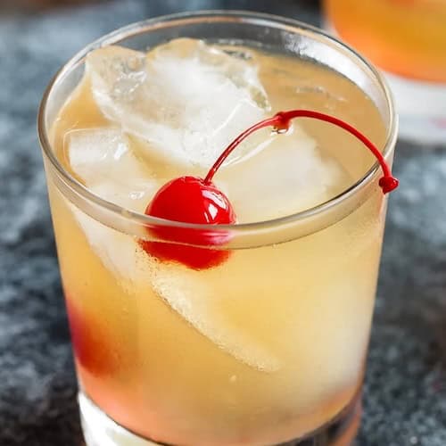Place the ingredients in a rocks glass filled with ice, stir and garnish with the maraschino cherry.
