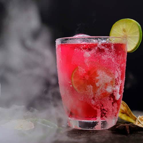 (Bring water and sugar to a simmer, stir until sugar dissolves, then add hibiscus and steep for 15 minutes. Strain and cool.)
